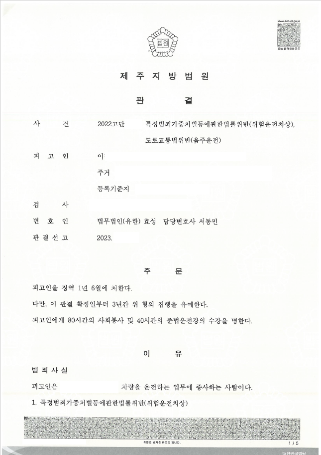 저는 경찰 조사부터 동석하여 이 사건의 경위, 음주수치, 음주운전 거리, 가정환경, 전과 등 양형사유를 중점적으로 주장 입증하였고 한편 피해자들과의 합의를 이끌어내어 법원은 집행유예를 선고하였습니다.