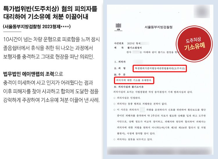 이와 같은 타당한 주장을 보고 사건을 담당한 서울동부지방검찰청에서는 의뢰인에 대해 불기소(기소유예) 처분을 내렸고, 의뢰인은 운송 업무에 계속 종사하며 생계를 유지할 수 있었습니다.