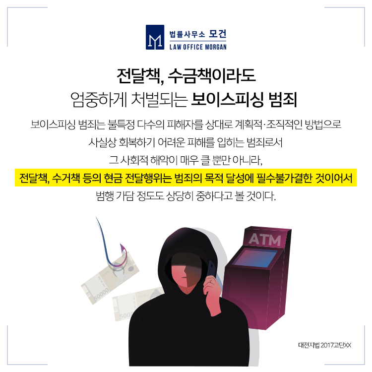 보이스피싱의 현금수거책은 비록 범행을 주도하지 않았다고 하더라도 범행 이익의 실현에 필수적인 것이어서 그 책임이 가볍지 않다고 보고 있습니다. 또 피해금이 클 수록 그 사안이 무겁다고 여겨지는 만큼 전문변호사와 함께 신중하게 접근하고 대응해나가는 것이 바람직합니다.