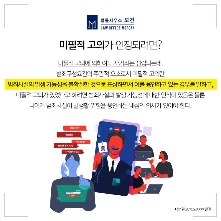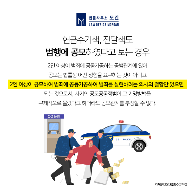 비록 피고인이 성명불상 조직원들의 구체적인 사기범행의 내용이나 방법에 대하여 인식하지 못하였다고 하더라도 자신이 피해자들로부터 건네받은 돈이 보이스피싱 범행의 피해금이라는 사실 및 이를 수거하여 송금하는 행위가 보이스피싱 범행의 일부분을 실현하는 행위임을 적어도 미필적으로나마 인식한 상태였다면 다른 가담자들과 순차적·암묵적으로 공모하여 기능적 행위지배를 통한 공동정범이 인정될 수 있는 것입니다.