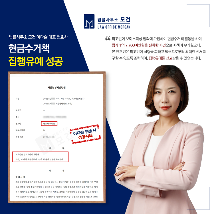 법률사무소 모건의 이다슬 대표 변호사는 총 9회에 걸쳐 합계 1억 7,749만원을 편취한 현금수거책 피고인을 변호하여 집행유예를 이끌어 낸 성공사례를 보유하고 있습니다. 보이스피싱 사건에서 수사조력과 피해자와의 합의대행, 재판에서의 선처를 이끌어내는데 최선을 다하고 있으니 도움이 필요하신 분들은 법률사무소 모건으로 문의하시기 바랍니다.