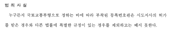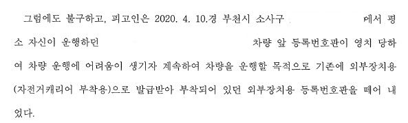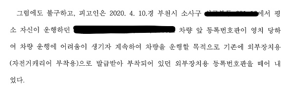 [사안] 피고인은 평소 자신이 운행하던 아버지의 차량 앞 등록번호판이 영치 당하자 기존 자전거 캐리어 부착용으로 발급 받아 부착되어 있던 외부장치용 등록번호판을 떼어 내어 사용을 하였습니다. 피고인은 이미 동일한 사건으로 처벌을 받은 전력이 있었습니다.