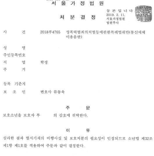 피해자는 합의를 거부하였으나, 소년의 진지한 반성과 부모의 훈육 지도 등을 강조하여 1호 처분 즉 부000의 감호위탁 처분을 받아내었습니다. 가장 낮은 처분입니다.