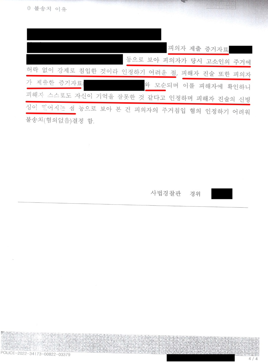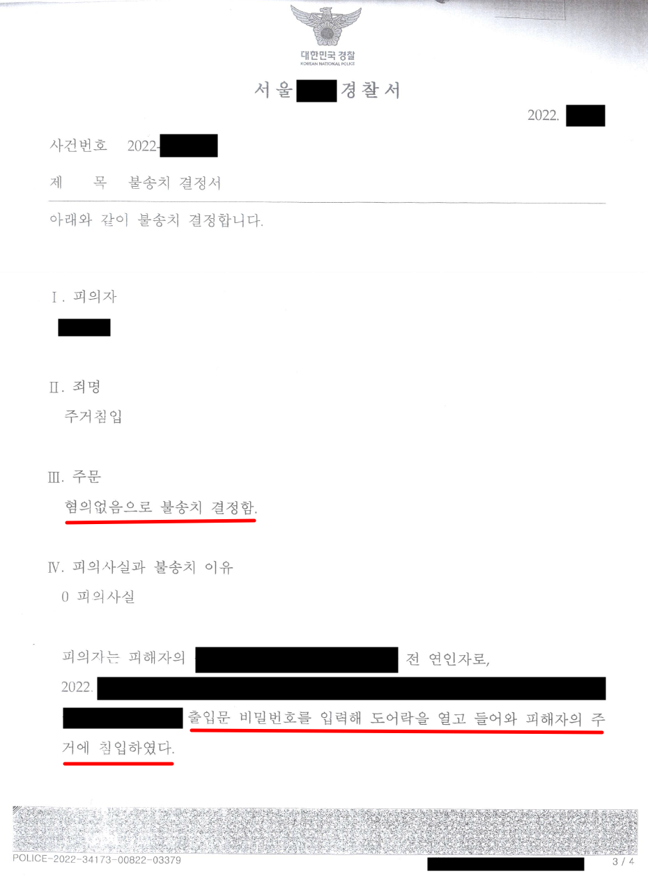 - 경찰 역시 변호인 의견서 내용대로, 이 사건 당시 의뢰인은 고소인의 동의를 얻어 고소인의 주거에 들어간 것으로 판단하였고, 결국 의뢰인에 대하여 무혐의 불송치 결정을 내렸습니다.