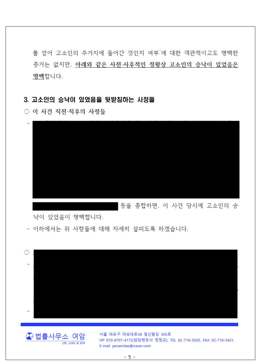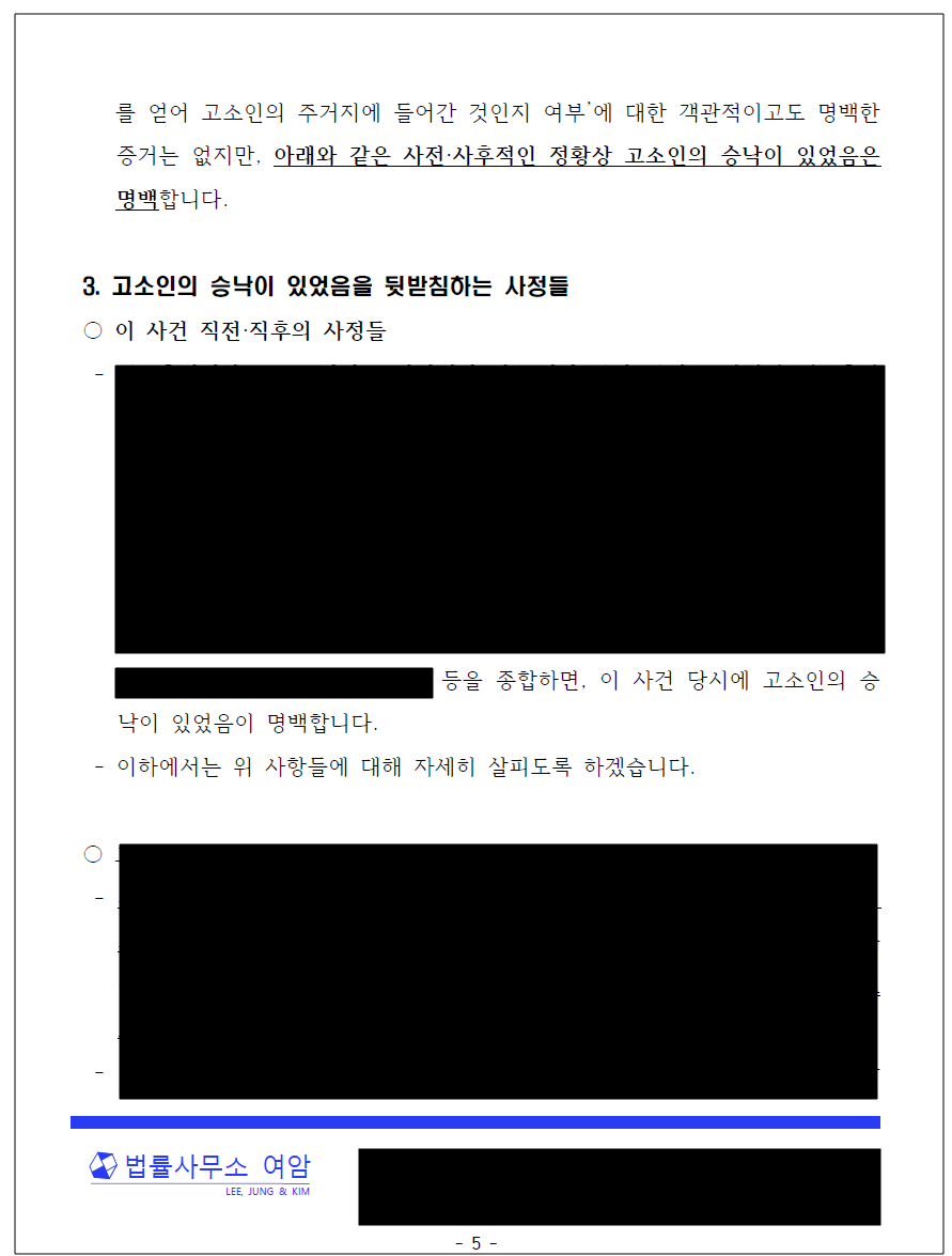 즉, 정정교 변호사는 ①사건 당일 날 의뢰인과 고소인의 카카오톡 대화, ②의뢰인의 행적, ③의뢰인과 고소인이 집에서 했던 일들, ④의뢰인과 고소인이 집에 나와서 했던 일들, ⑤이 사건 이후의 고소인의 태도 등을 낱낱이 정리하였습니다.