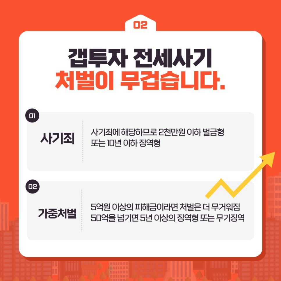 참고로 갭투자 전세사기를 벌였다면 이는 사기죄에 해당하므로 2천만원 이하 벌금형 또는 10년 이하 징역형 처벌을 받게 됩니다.