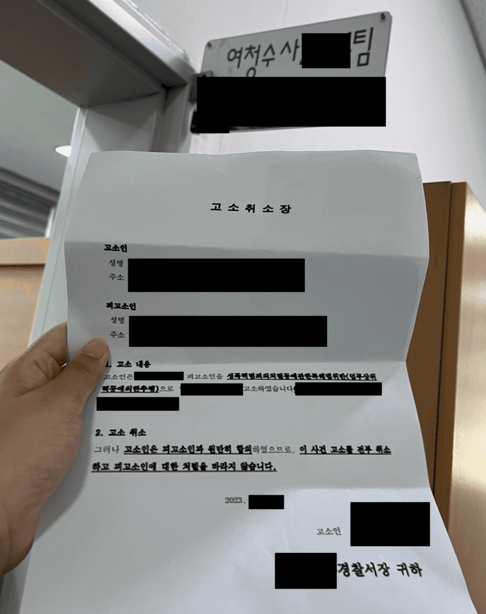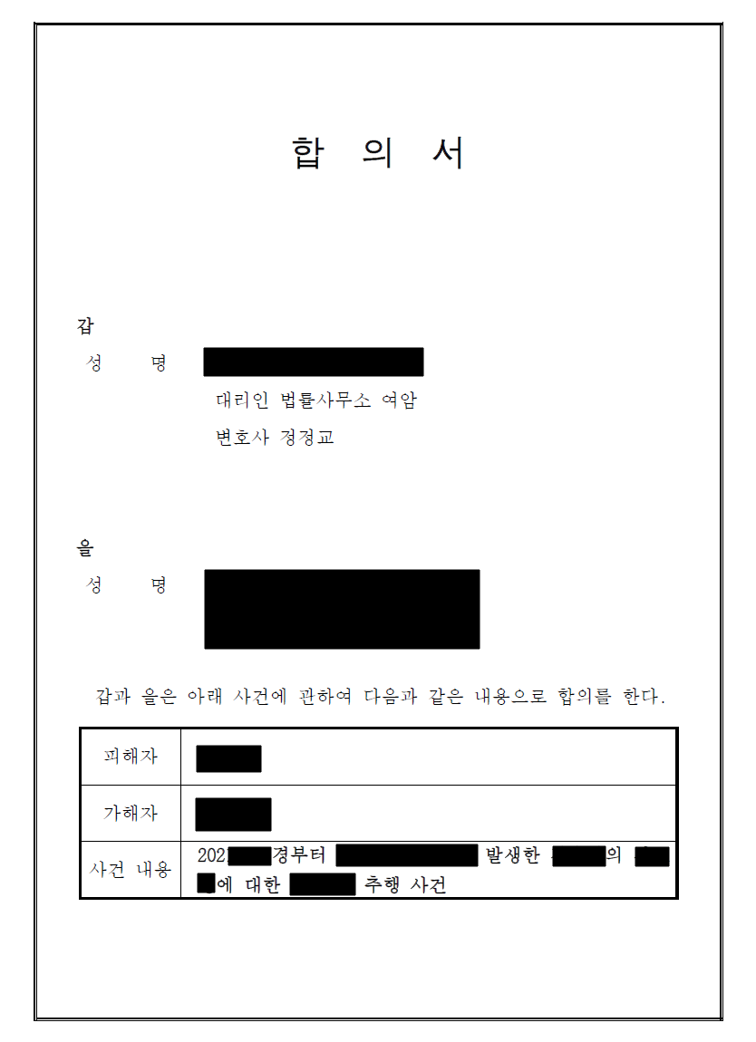 - 의뢰인께서는 상대방과 합의를 하고 합의금을 곧바로 수령하신 다음, 정정교 변호사가 작성한 합의서에 날인을 한 뒤 경찰서에 직접 고소취소장을 제출하셨습니다.