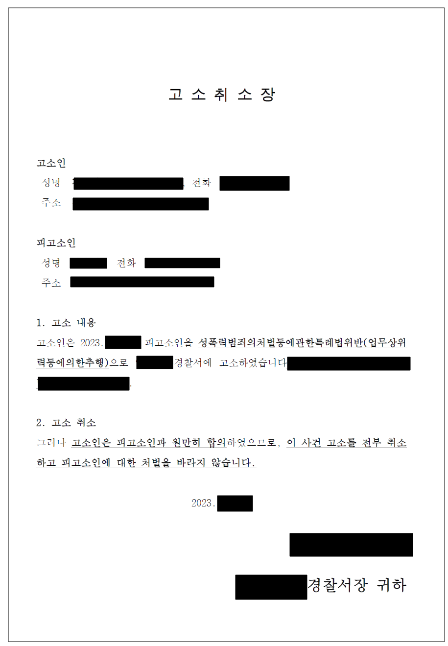 - 이처럼 의뢰인 피의자 사이에 극적으로 합의가 타결되었고, 정정교 변호사는 마지막으로 합의서 및 고소취소장을 작성하여 합의 절차를 마무리 지었습니다.