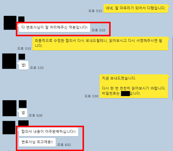 의뢰인께서는 아래와 같이 사건의 결과에 대해 매우 만족해 하셨습니다.