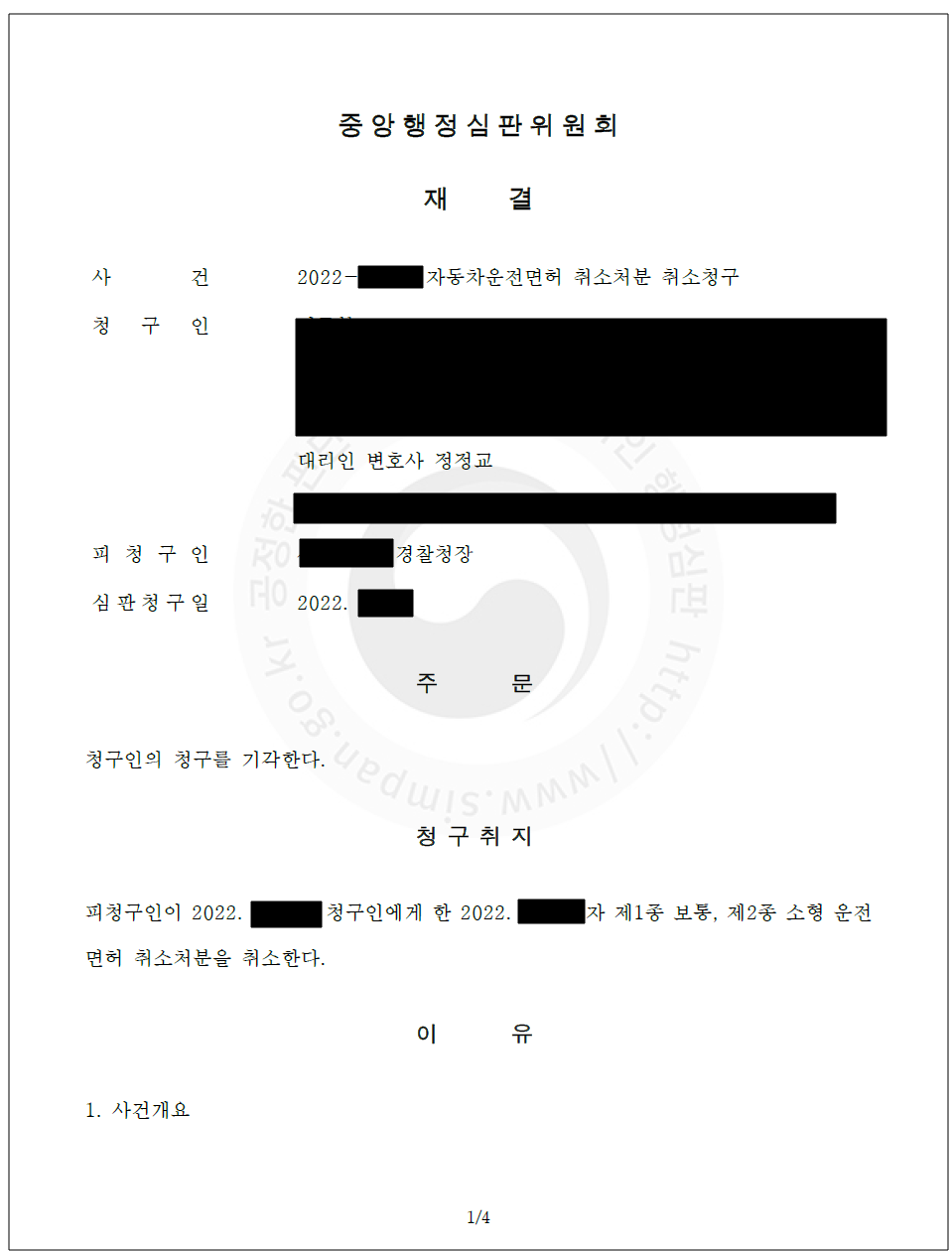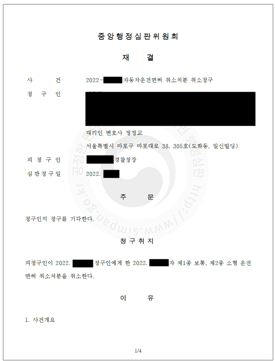 정정교 변호사의 예측대로, 행정심판위원회는 운전면허취소처분에 대한 취소를 받아들여주지 않았습니다. 정정교 변호사는 이러한 수순을 이미 예측하고 있었고, 의뢰인에게도 충분히 설명을 해드렸기 때문에 의뢰인도 당황해하지 않으셨습니다.