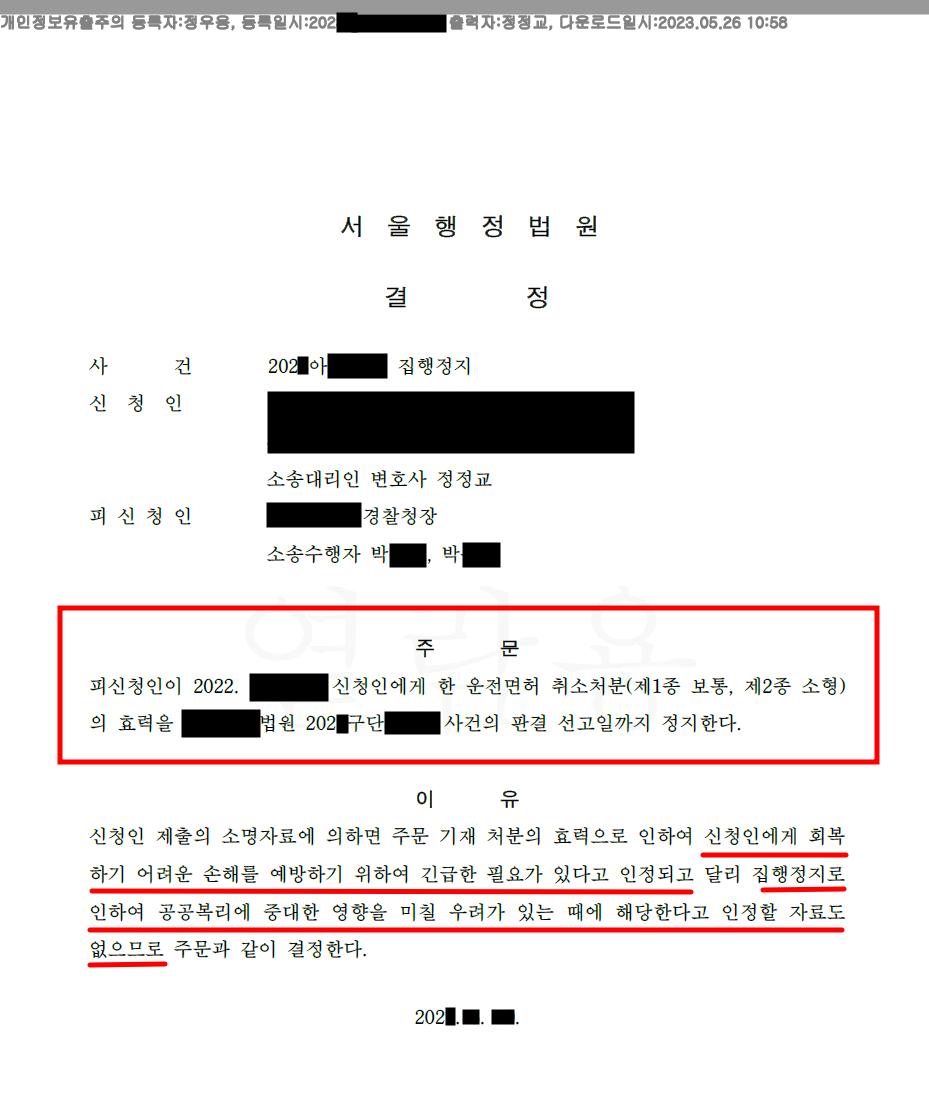 - 정정교 변호사는 의뢰인에게 본안소송(운전면허취소처분 취소소송)과는 별개로 집행정지를 인용받기 위한 자료를 추가적으로 요청하였고, 의뢰인께서는 요청받은 자료를 빠짐없이 준비해주셨습니다.