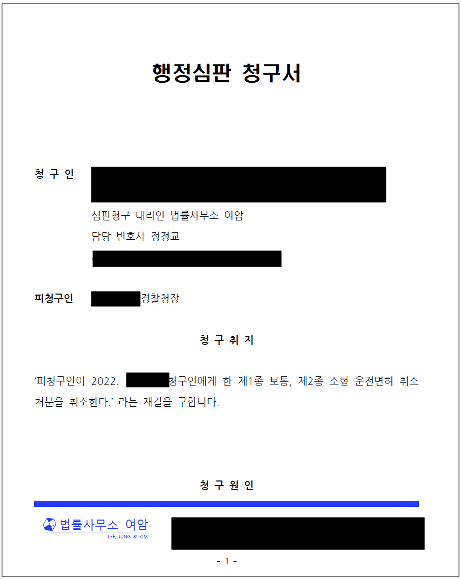 - 이에 따라 정정교 변호사는 신속하게 행정심판부터 준비하였습니다. 행정심판위원회는 정부 기관으로서 사법기관이 아니기 때문에 법리적인 판단이 다소 약한 것이 사실이기 때문에, 이 사건의 특성상 행정심판을 통해 구제받기는 어려울 것으로 판단했습니다.