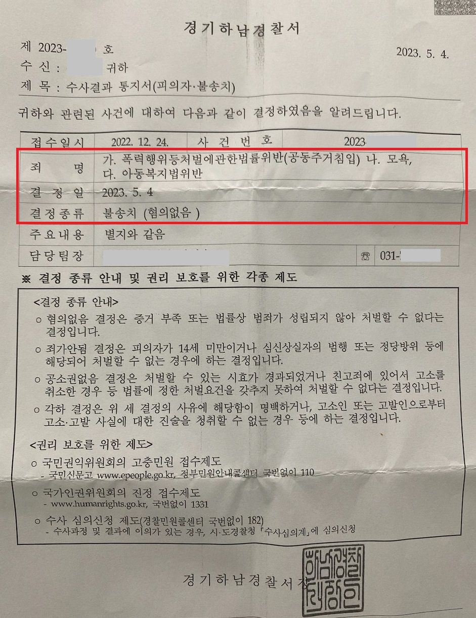 - 고소된 혐의 전부에 대해 무혐의 처분을 받았습니다.