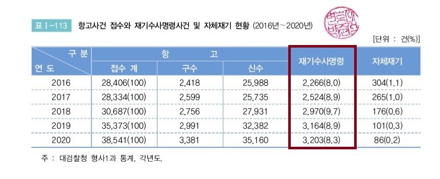 아래는 검찰항고에 대한 재기수사명령(항고 인용)의 비율 통계이고 대체로 8~9%에 머뭅니다.