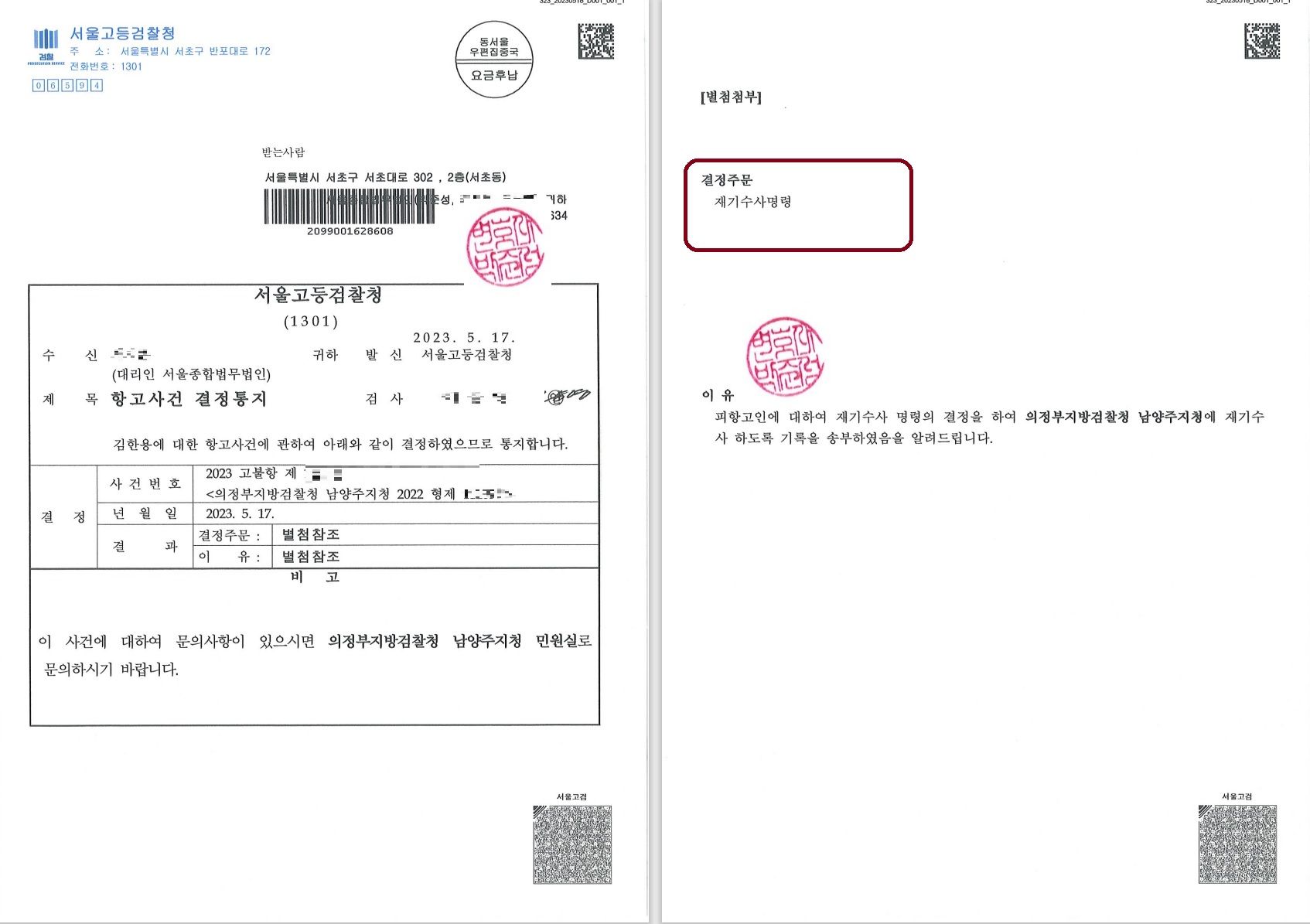 3. 불송치, 불기소에 불복하여 검찰 항고 성공 - 재기수사명령