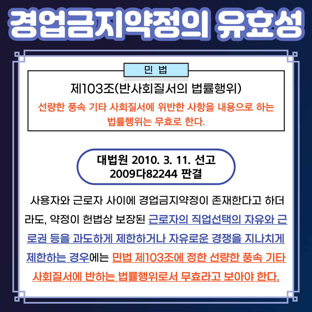사용자와 근로자 사이에 경업금지약정이 존재한다고 하더라도, 그와 같은 약정이 헌법상 보장된 근로자의 직업선택의 자유와 근로권 등을 과도하게 제한하거나 자유로운 경쟁을 지나치게 제한하는 경우에는 민법 제103조에 정한 선량한 풍속 기타 사회질서에 반하는 법률행위로서 무효라고 판단합니다.