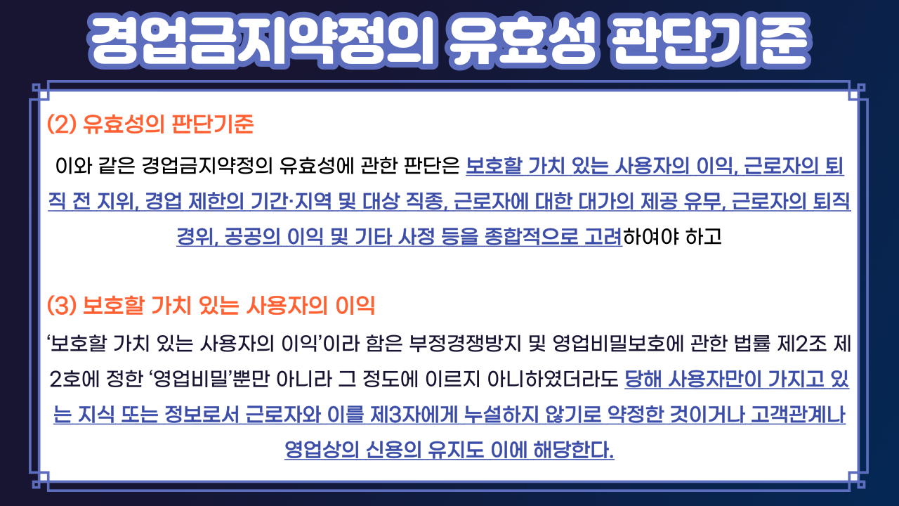 이와 같은 경업금지약정의 유효성에 관한 판단은 보호할 가치 있는 사용자의 이익, 근로자의 퇴직 전 지위, 경업 제한의 기간·지역 및 대상 직종, 근로자에 대한 대가의 제공 유무, 근로자의 퇴직 경위, 공공의 이익 및 기타 사정 등을 종합적으로 고려하여야 하고