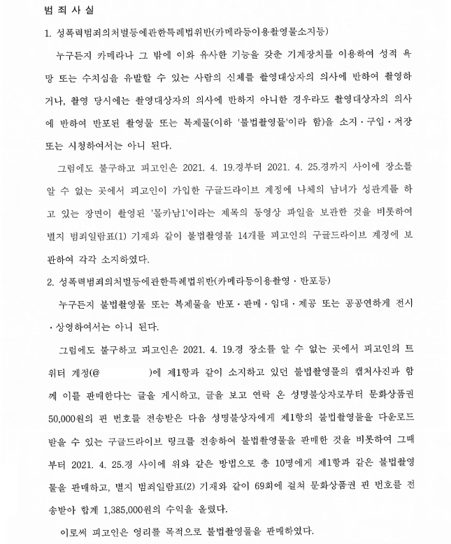 A씨는 2021. 4. 19.경부터 25.경까지 '윤XXX' 불법촬영물을 총 10명에게 69회에 걸쳐 판매하였습니다.