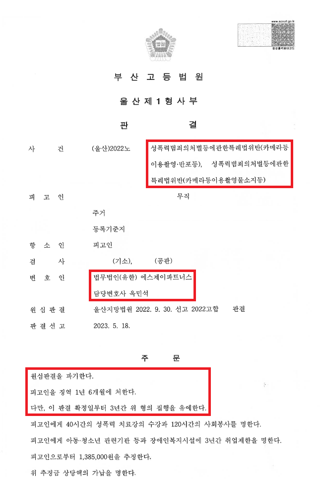 이러한 저의 조력을 바탕으로 A씨는 최근 사회적으로 큰 문제가 되고 있는 '윤XXX' 불법촬영물을 판매하고 그 피해자가 총 11명에 달할 뿐만 아니라 생을 마감한 피해자도 있었음에도 불구하고 징역 1년 6월을 선고한 원심판결이 파기되고 집행유예를 선고받음으로써 구속 상태에서 벗어날 수 있었습니다.