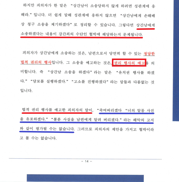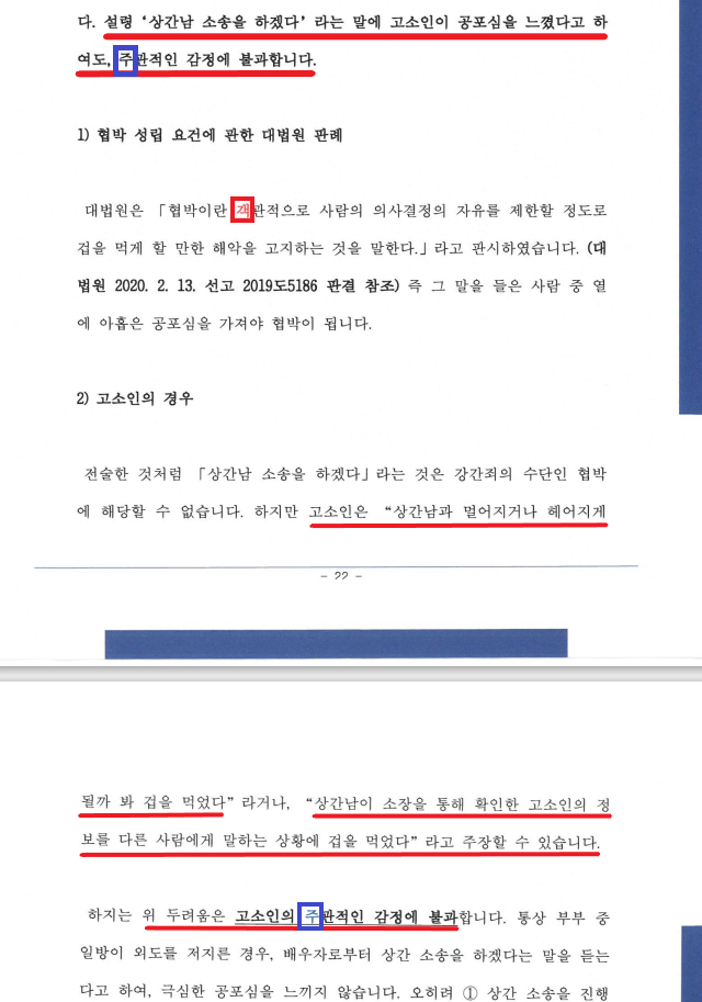 - 설령 B가 A의 상간 소송 예고에 극심한 공포심을 느껴서 성관계에 응하였어도, 이는 지극히 주관적인 공포심임