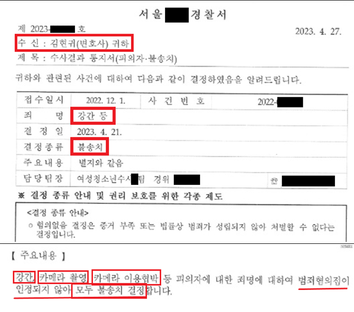 너무 다행히도 담당 수사관은, 변호인의견서 논리를 그대로 수용하여, 강간, 카찰, 카촬이용 협박 세 혐의 모든 것을 불송치 처분하였습니다.