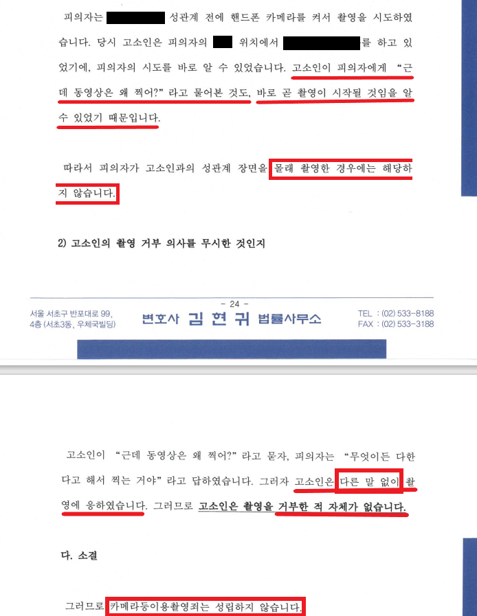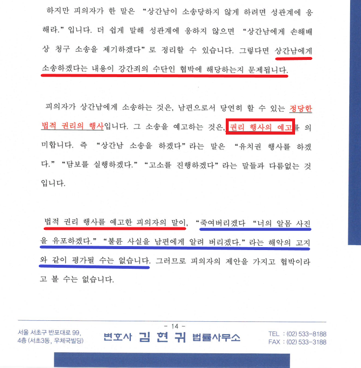 ⑤ B는 A로부터 "이 영상을 상간남에게 보내버리겠다"라는 말을 들었다고 하나, A는 위 말을 한 사실이 전혀 없음. B의 주장은, 상간남 소송을 사전에 차단하기 위한 불순한 의도로 이뤄졌을 가능성이 매우 농후함.