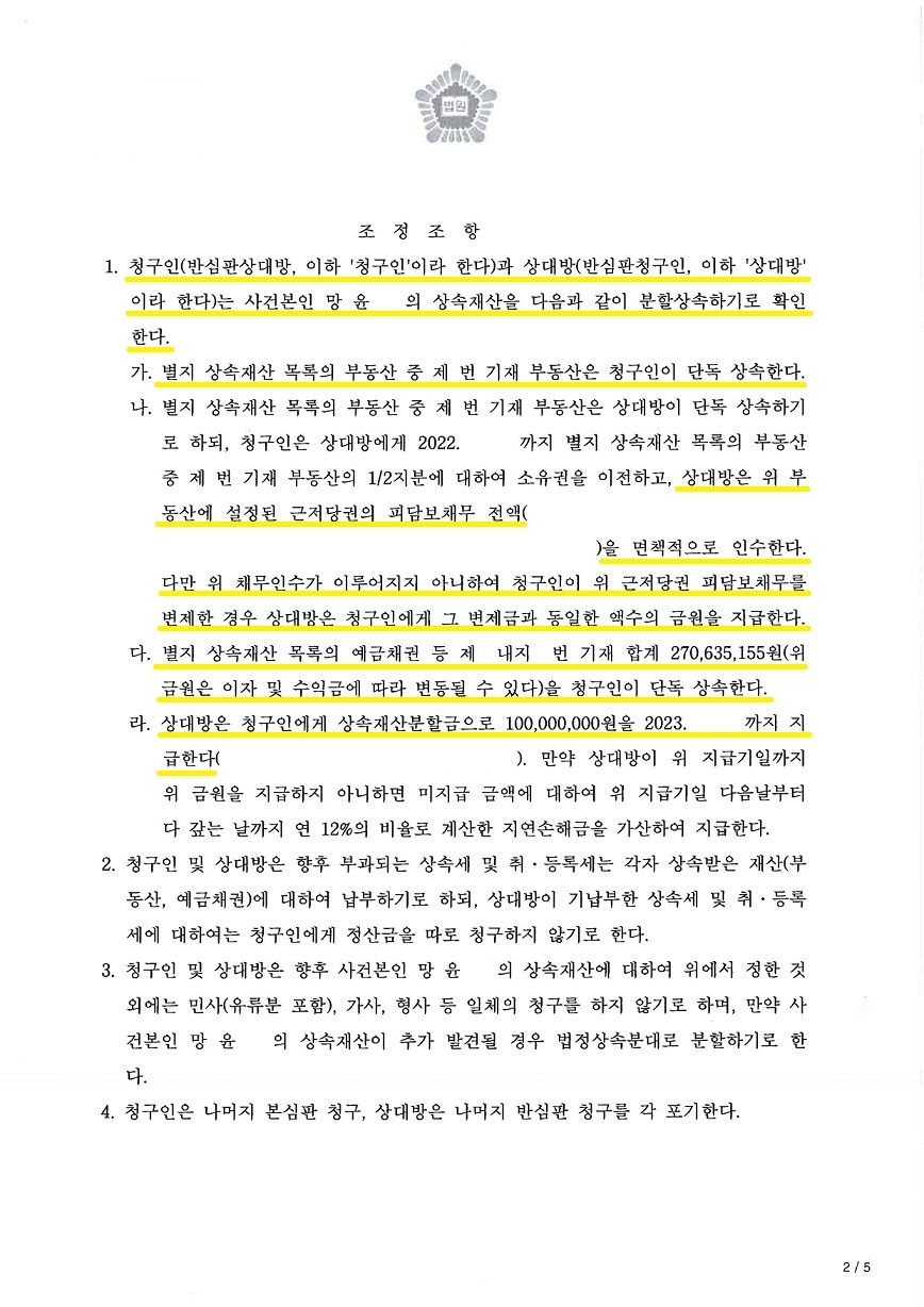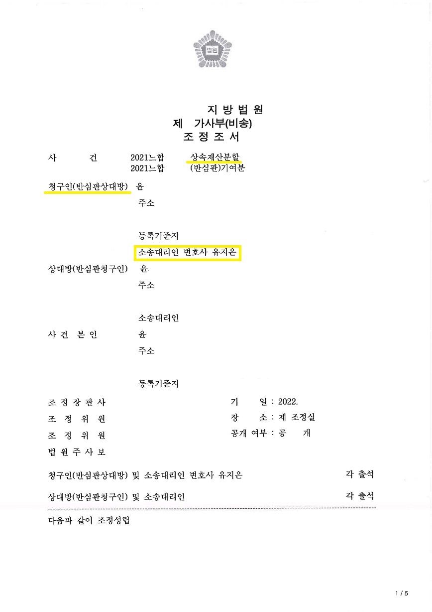 이에 저희는 사실조회를 통해 언니의 특별수익 내역을 전부 확인하였고, 각 부동산에 대하여 감정신청을 하여 위와 같은 자료를 토대로 조정기일에 상대방측과 조정위원 및 판사님을 적극 설득한 끝에 저희에게 유리한 합의안을 도출할 수 있었습니다.