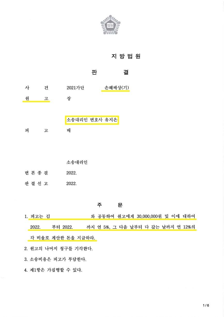 결국, 기존 재판부인 민사법원에서 상간녀는 남편과 공동하여 3천만 원을 지급하라는 판결이 나왔고, 소송비용 또한 피고가 부담하는 것으로 나왔으며, 남편은 결국 이혼 소송을 취하하며 성공적으로 마무리가 된 사안입니다.