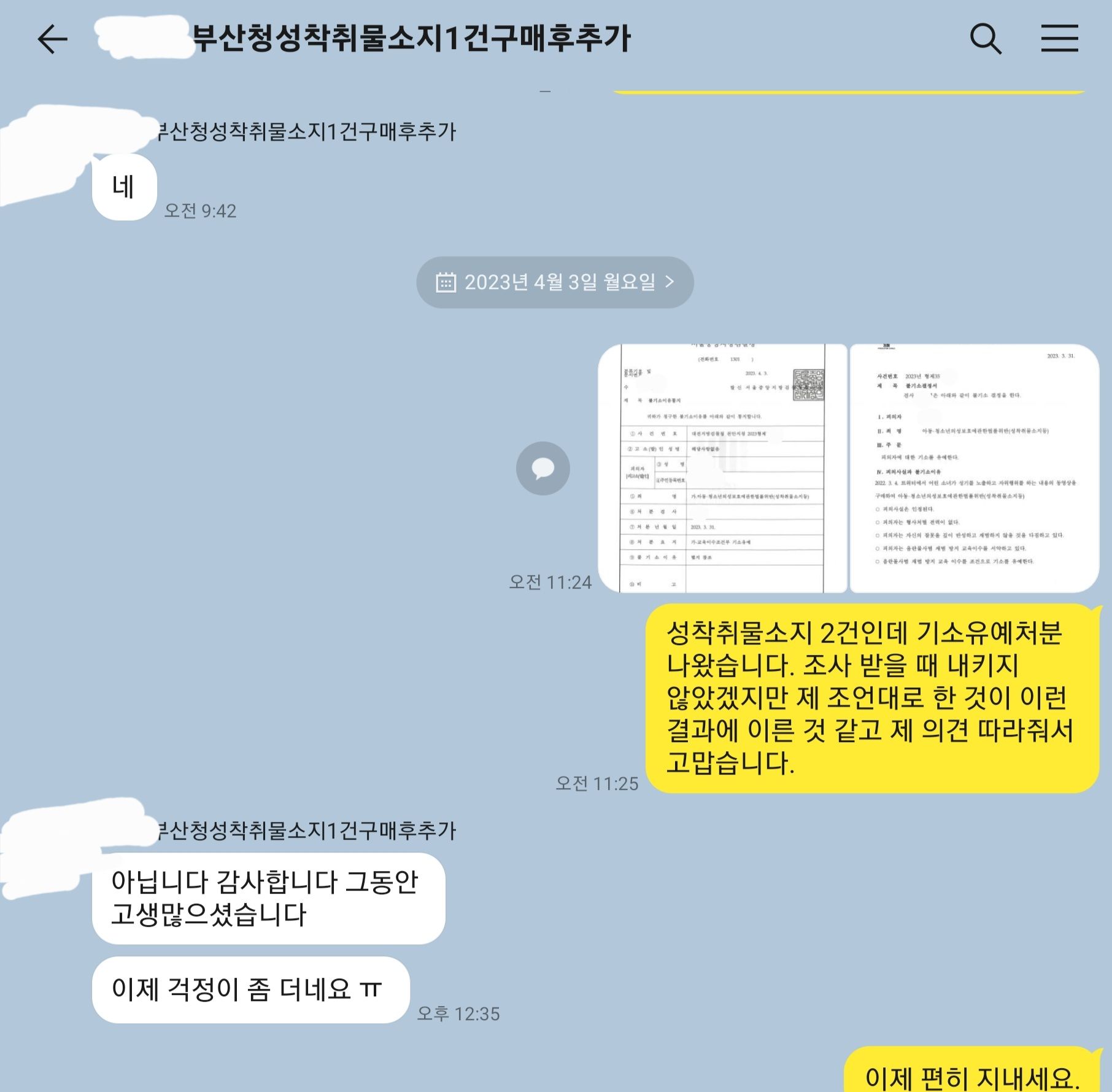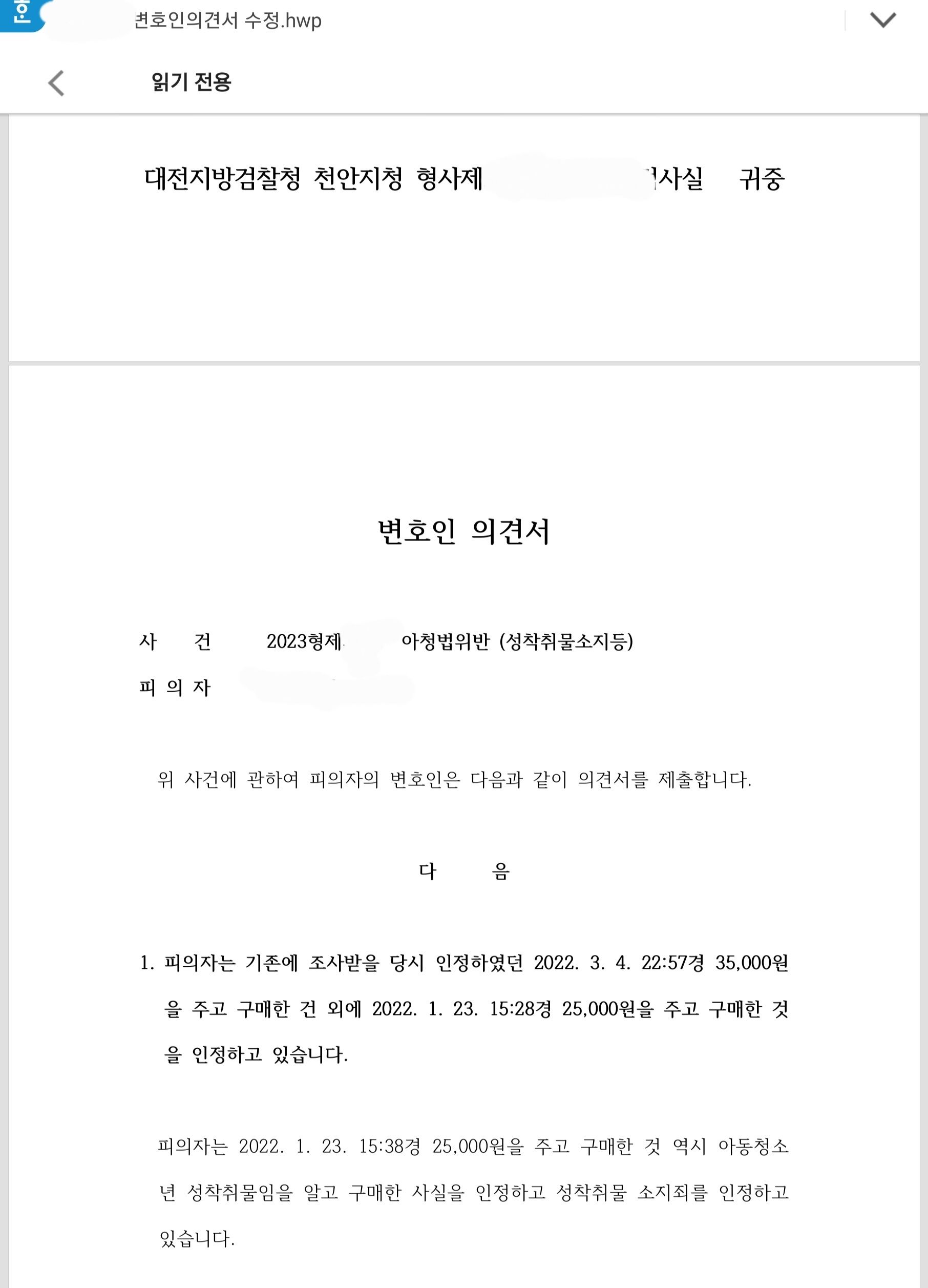 제 예상대로 22년 9월에 경찰 조사를 받은 이후 한참이 지난 올해 3월 검사실로부터 연락이 왔습니다. 추가 구매 이력이 발견되어 추가 조사가 필요하다는 취지였습니다. 검사님도 바쁘고 사건이 많은데 추가 조사를 하지 않고 처분을 내릴 수 있도록 내용을 확실히 인정하는 의견서와 양형자료 등을 제출하겠다고 하였습니다.