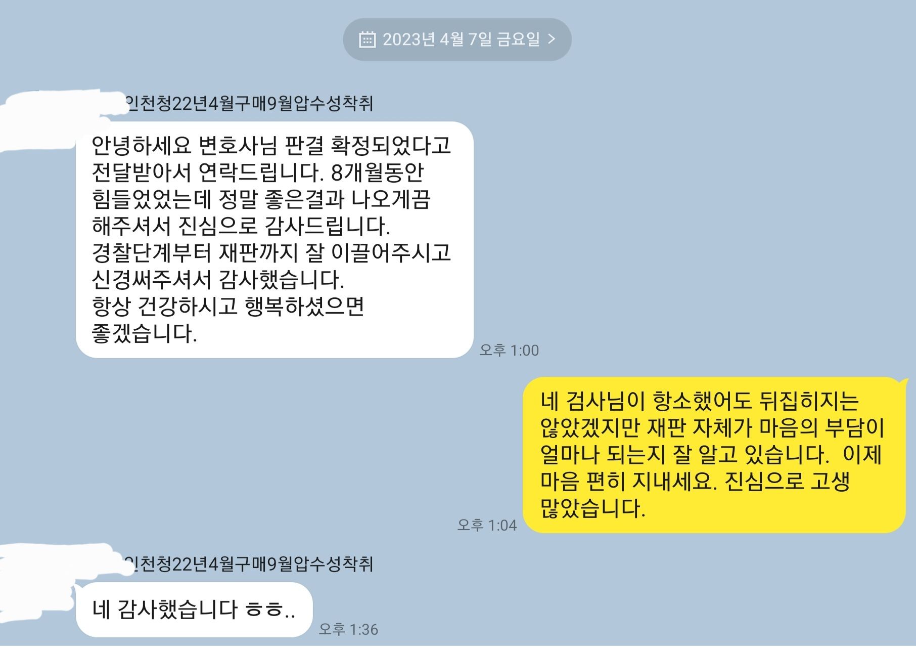 간단히 얘기해서 저는 제가 잘 했으면 조사입회 1번으로 끝났을텐데 조사입회가 여러 번인 것을 누구 탓을 하냐는 마인드가 있습니다. 이러한 계약방식은 저에게도 수회 조사 없이 1번의 조사 이후 간단히 혐의없음으로 마무리하고자 하는 유인도 있는 것입니다. 물론 위 사건은 예상을 넘는 결과라 생각하고 있으며 대단히 변호를 잘하였다고 자부하고 있습니다. 의뢰인과 가족도 당연히 매우 기뻐하였습니다.