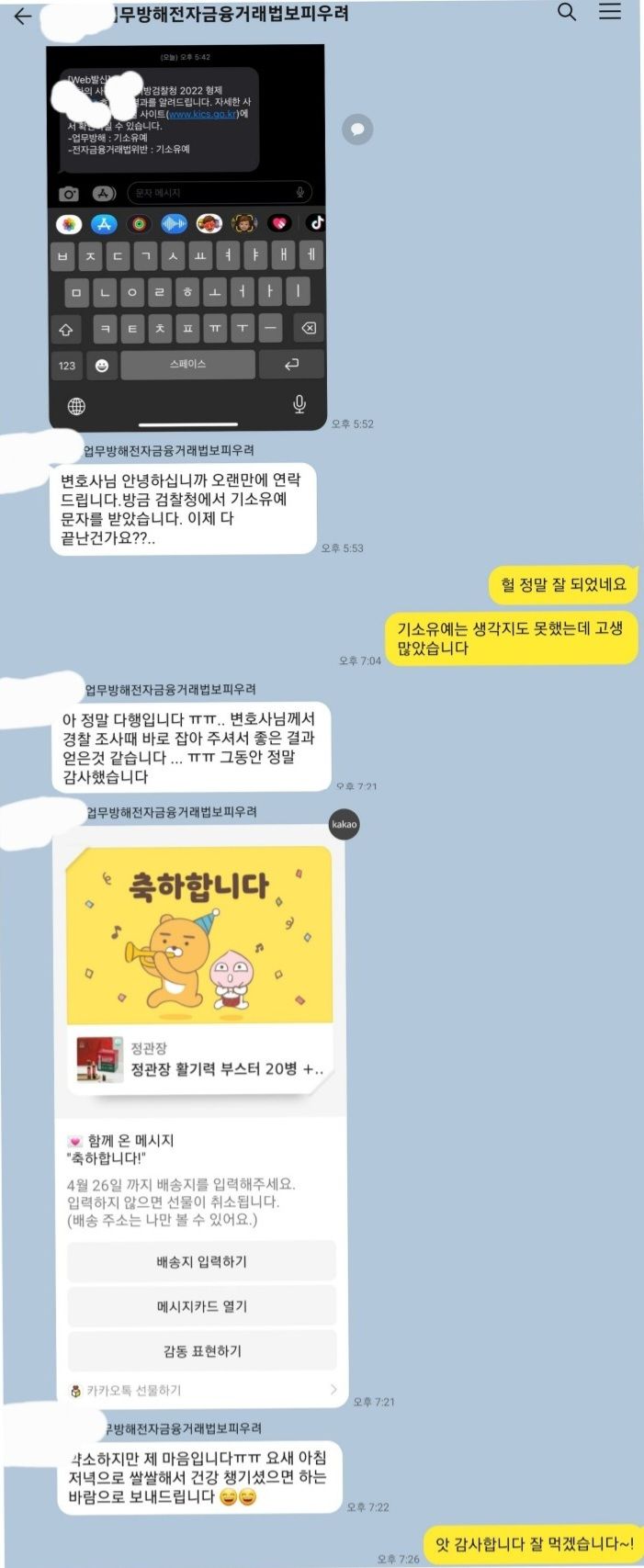 의뢰인은 매우 기뻐하였고 저 역시 보람을 느꼈습니다. 제가 보이스피싱, 통장양도 등 관련하여서는 맡은 사건들의 결과들이 매우 좋은데 제가 자신있게 변호할 수 있는 분야입니다.