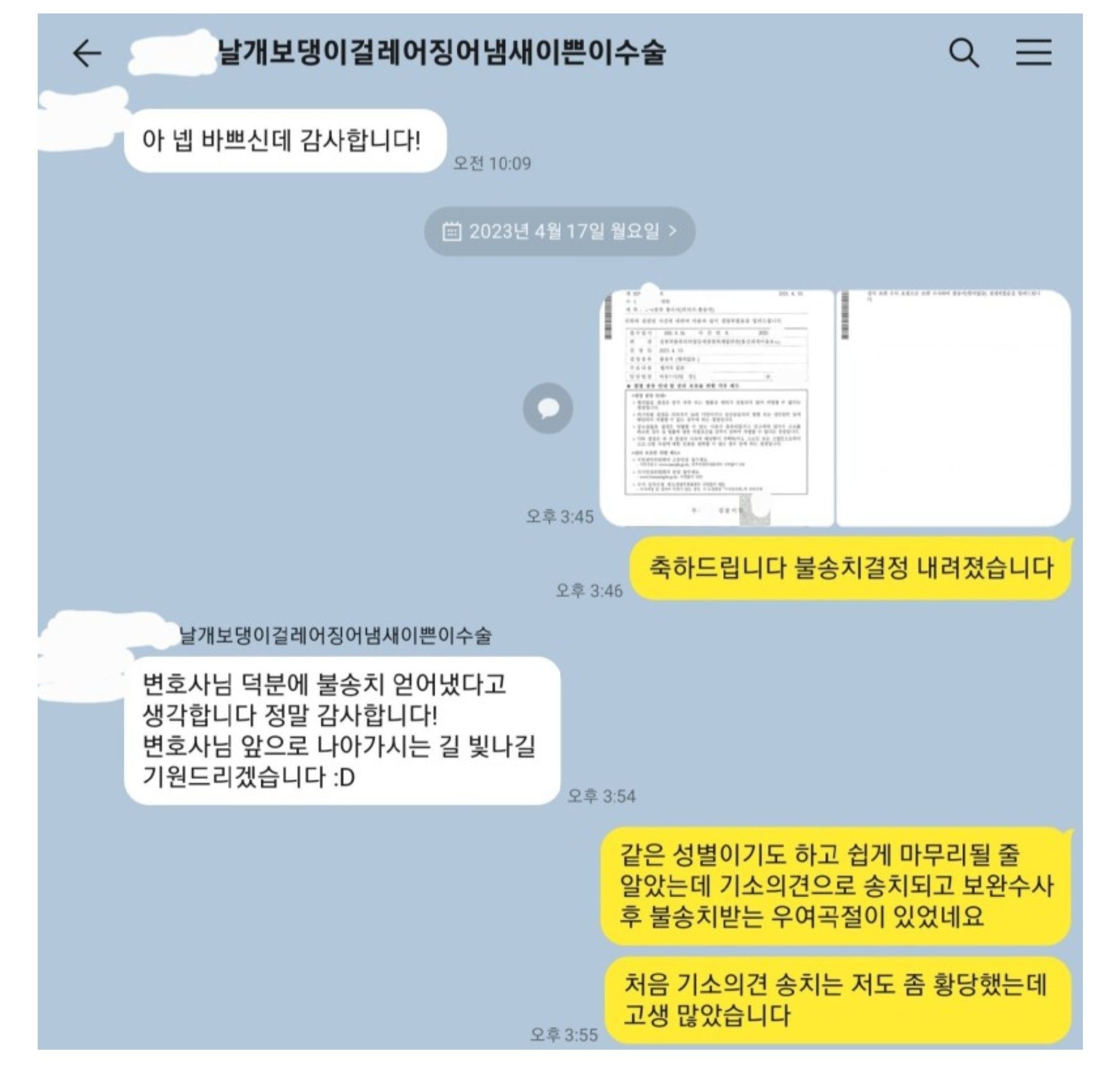 의뢰인이 보낸 채팅 내용은 위와 같습니다. 이 사건의 특징은 의뢰인의 성별도 여자였다는 것입니다. 피의자의 성별에 따라 변호할 수 있는 큰 포인트가 있습니다. 의뢰인의 성별도 여자이고 보낸 채팅의 내용도 어렵지 않은 사안이라 쉽게 불송치로 마무리 될 것으로 예상하였습니다. 그러나 예상과 달리 기소의견으로 송치되어 좀 황당한 생각도 들었습니다.