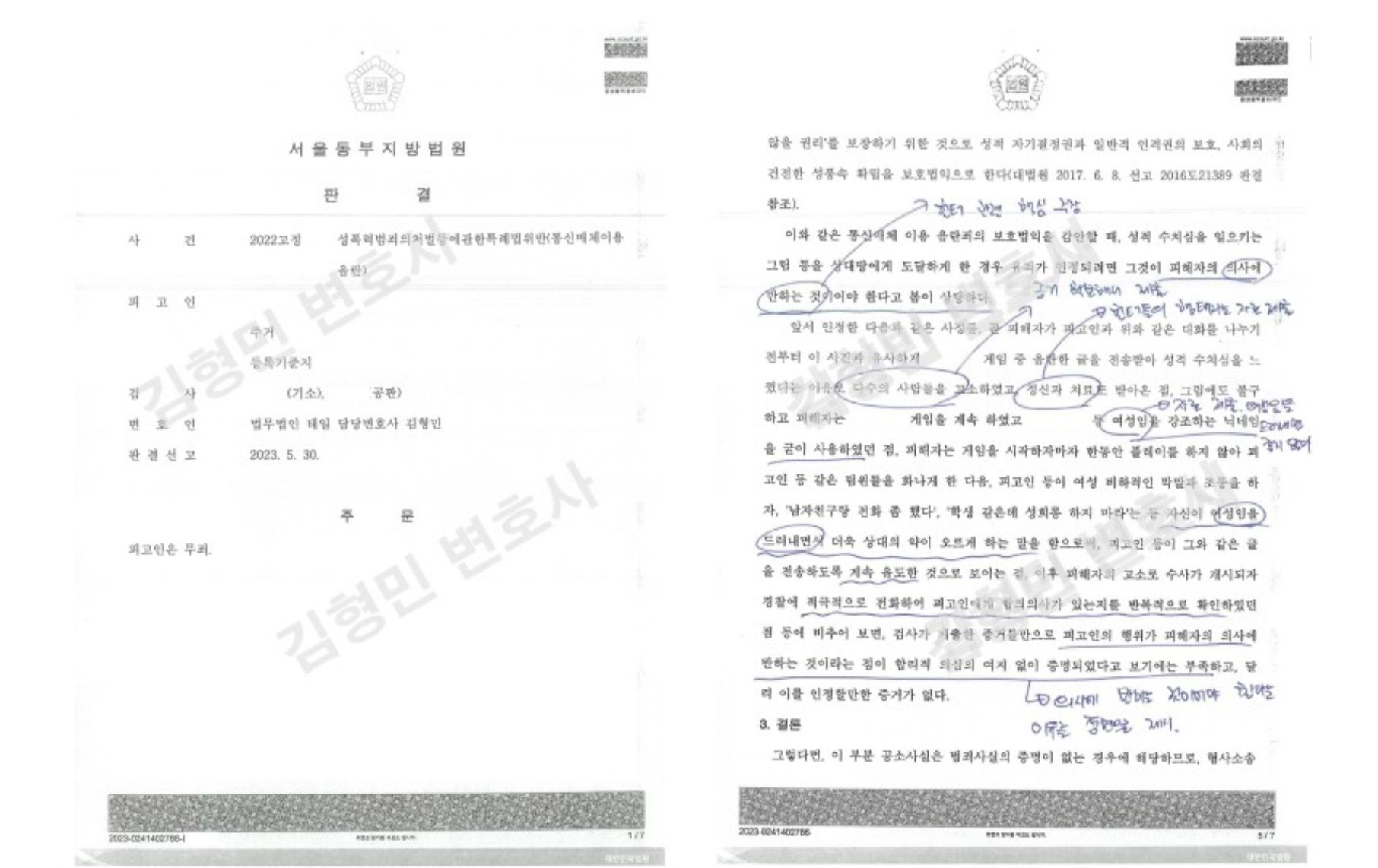 통매음의 보호법익이 성적 자기결정권이므로 보호법익을 감안할 때 피해자의 의사에 반하는 것이어야 성립할 것입니다. 이러한 주장 하나만을 정면으로 받아들여 무죄로 내린 판결이라 통매음 무죄판결에서도 의미가 큰 판결이라 생각됩니다.