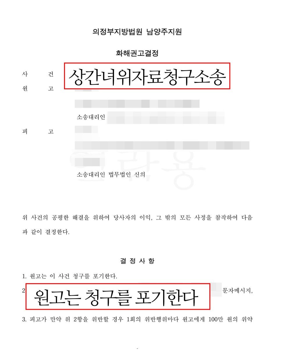 이러한 변론에 힘입어 결과적으로 A씨의 아내로부터 위자료 청구 포기를 이끌어내, 피고였던 의뢰인의 실질적 승리로 마무리가 되었습니다.