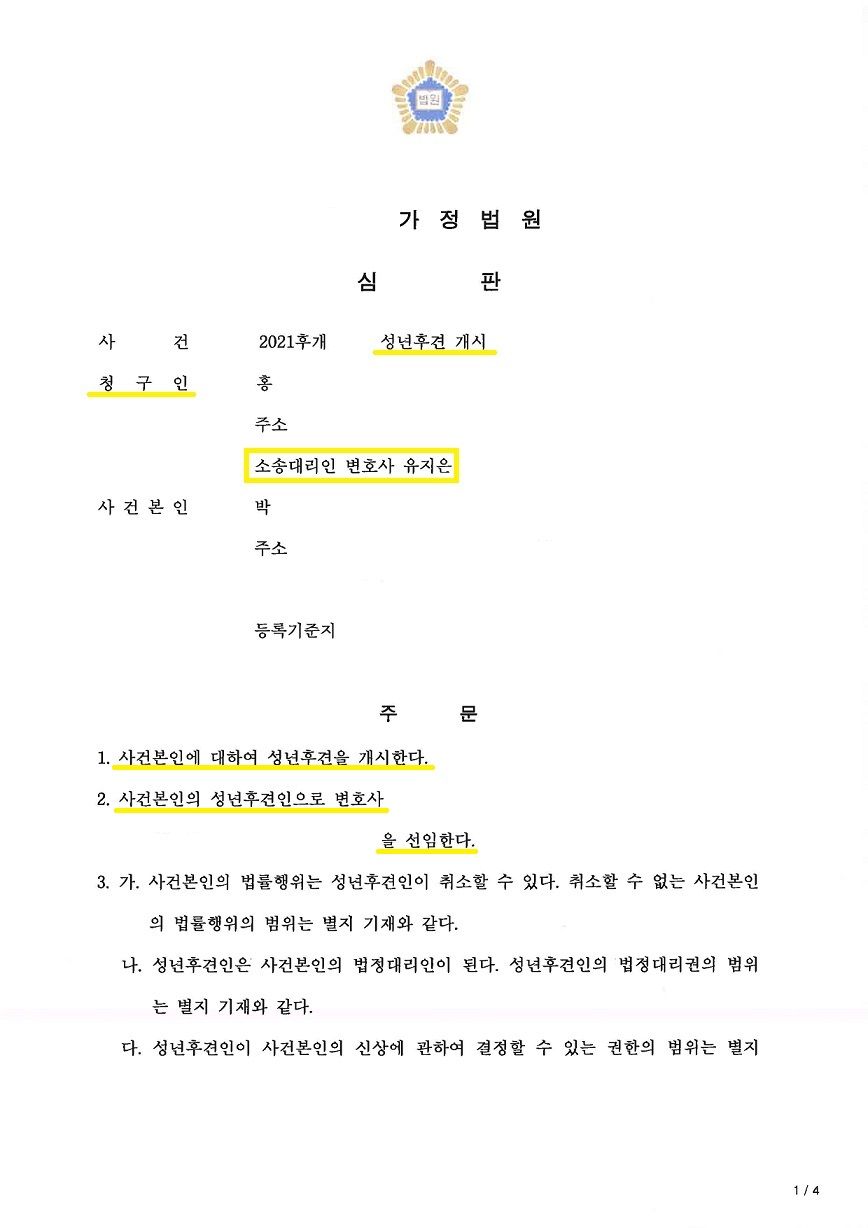 우선 저희는 이모에게 먼저 1억 5천만 원을 어머니에게 즉시 반환하라는 내용으로 내용증명을 보냈고, 성년후견개시심판청구를 하면서 어머니의 정신감정을 신청하였습니다. 정신감정 결과 인지기능에 심각한 문제가 있음이 밝혀졌음에도 자녀들 중 일부는 성년후견이 개시되는 것에 반대하였고, 이에 어머니의 현 상태가 계속적인 보호가 필요한 상황임을 소명하여 성년후견이 개시될 필요성을 적극 주장하였습니다.