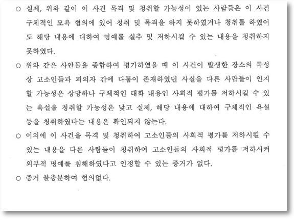 한 마디로, 다른 사람들이 오가는 장소에서 욕설을 했고 다른 사람들이 듣기도 했지만, 구체적으로 어떤 욕설인지 들은 것이 확인되지 않았기 때문에 공연성이 없다고 판단한 것입니다. 얼핏 듣기에는 그럴듯한 것 같죠? 그러나 사실 법리적으로는 완전히 틀린 얘기입니다.