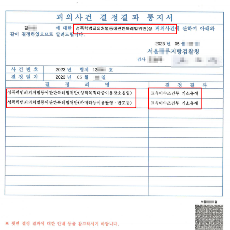 이번 사례는 제가 2022년 11월경에 로톡에서 수임하여 진행했던 사건으로, 고등학생이 여자 성기를 촬영할 목적으로 여자화장실에 카메라를 설치한 사건을 방어하여 교육이수조건부 기소유예 처분결정을 받은 사건입니다.
