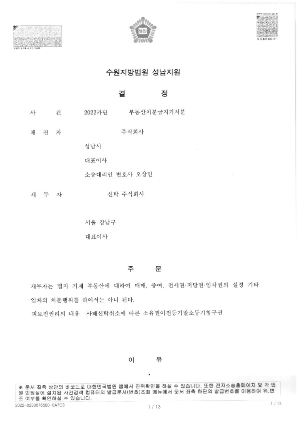 (1) 다행히 법원에서 의뢰인을 신청인으로 하는 부동산처분금지가처분 신청을 받아주어 위탁자를 신청인으로 하는 공매절차중지가처분은 계속하여 진행할 필요가 없게 되었습니다.