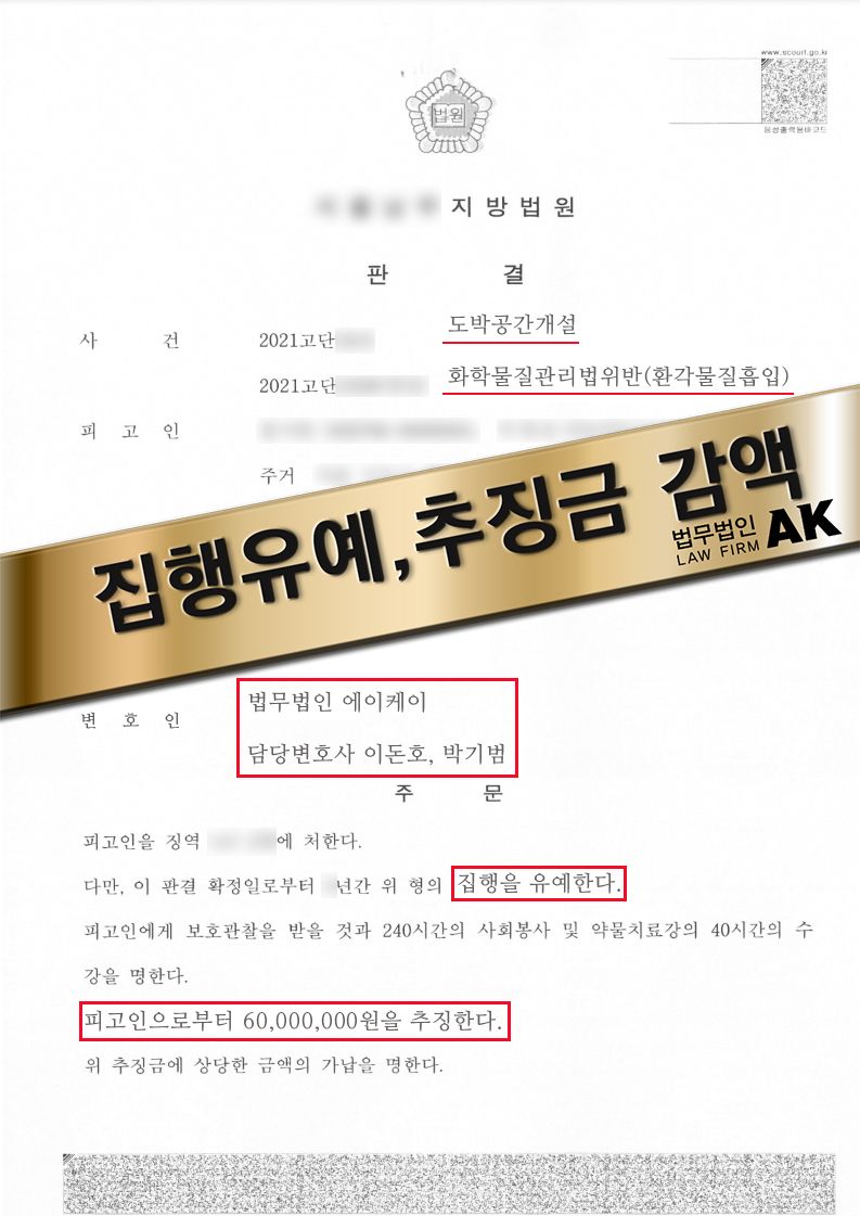 또한, 검사는 이에 또 다시 형법상 추징을 주장하였으나 변호인은 도박공간개설죄로 기소된 사안에서 도박하여 수익한 돈을 추징하는 것은 기소사실과 관련이 없는 죄에 대한 추징으로써 위법한 추징이라고 주장하여 재판부를 설득하는데 성공하였습니다.