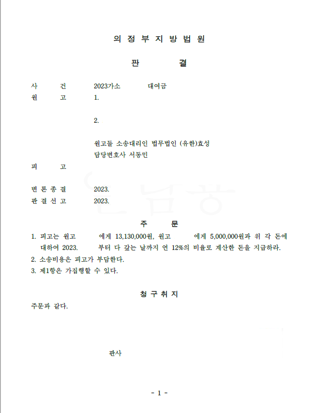저는 즉각 대여금청구소송을 제기하였고 법원은 원고 전부 승소 판결을 선고하여 의뢰인들은 대여금을 변제받게 되었습니다.