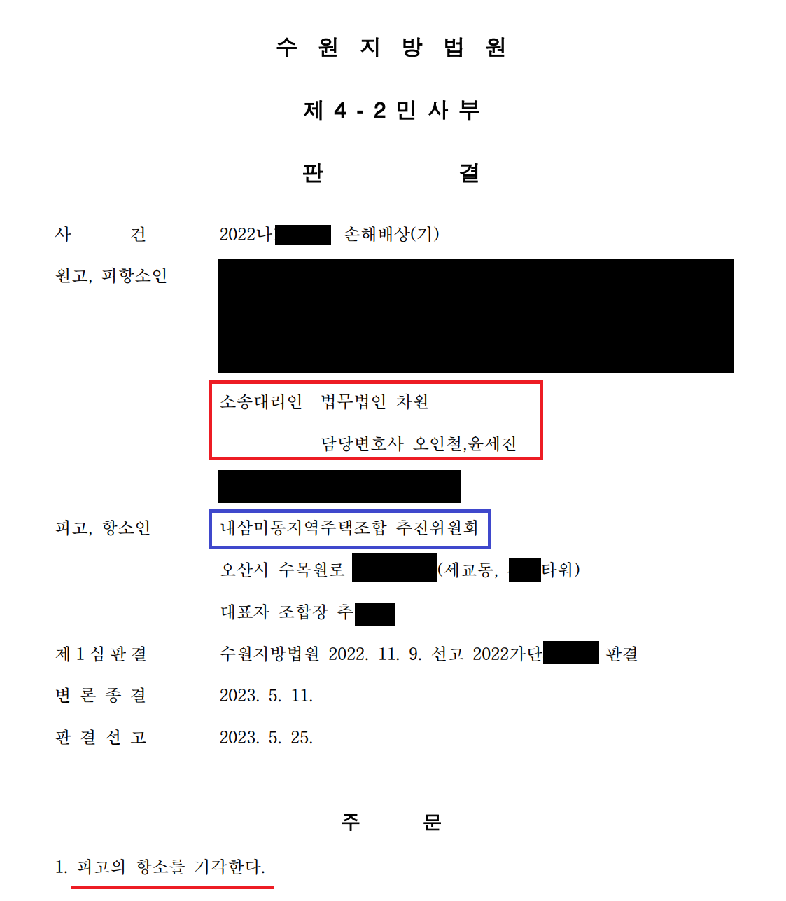 이번에도 재판부는 저의 주장을 받아들여, 제1심에서의 사실인정과 판단은 정당한 것으로 인정됨을 그 이유로하여, 내삼미동 지역주택조합 추진위원회 측의 항소를 기각하였습니다.
