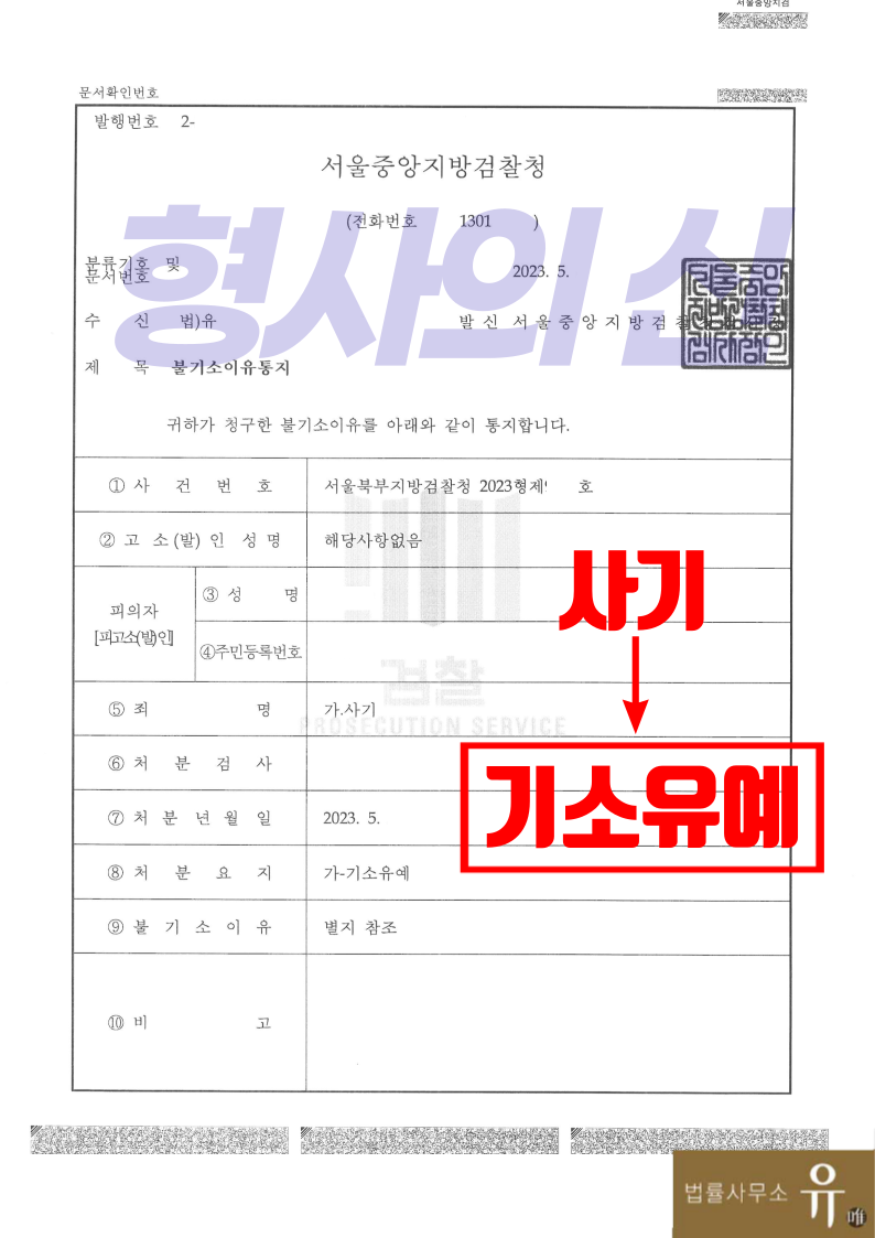 본 사건은 의뢰인이 합의할 여력이 되지 않아서 피해자와 합의를 하지 못해 처벌을 피하기 어려웠던 사건입니다. 그럼에도 불구하고 법률사무소 유(唯)의 형사전문변호사는 의뢰인 또한 보이스피싱 조직원으로부터 기망을 당한 것이며 사회적 경험이 부족한 점을 의견서로 최대한 소명할 수 있도록 노력하였고, 그 결과 서울북부지방검찰청은 법률사무소 유(唯)의 형사전문변호사가 작성한 이러한 변호인의견서의 내용을 그대로 받아들여 피해자들과 합의가 이루어지지 않았음에도 불구하고 기소유예 처분을 받을 수 있었습니다.