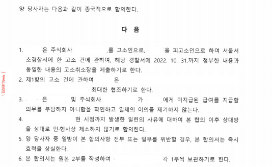 업무상횡령죄 고소취소를 조건으로 밀린 연봉에 대한 권리를 행사하지 않기로 하며, 더 이상의 분쟁을 종식시키자는 제안이었습니다.