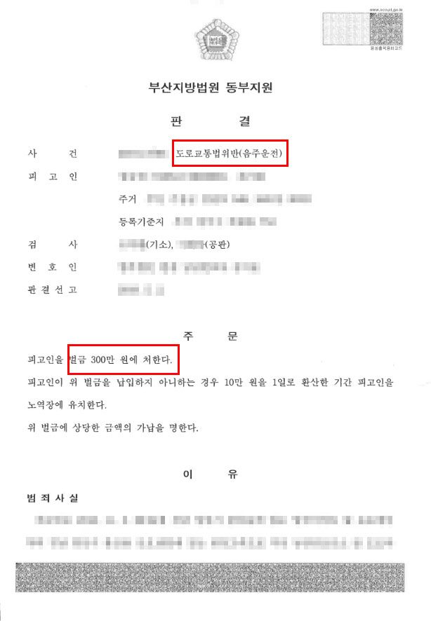 하지만 다행히 음주운전으로 적발될 당시 혈중알코올농도 수치가 높지 않았던 점, 그리고 의뢰인이 자신의 범행에 대해 진지하게 반성하고 있다는 점 등 유리한 양형자료로 최대한 선처를 요청해 벌금형을 이끌어낼 수 있었습니다.