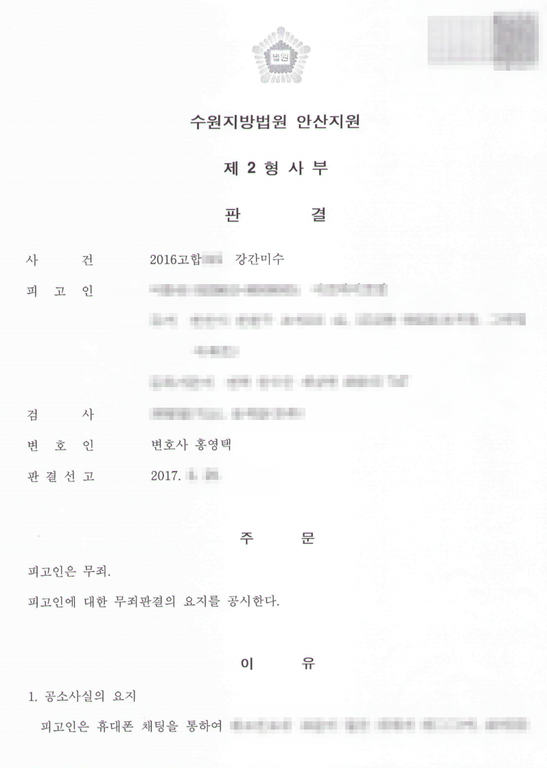 위 사건에 대하여 검사가 항소하였지만 항소기각되었고, 본 변호인이 무죄 판결에 따른 형사보상 청구까지 도와드렸습니다.