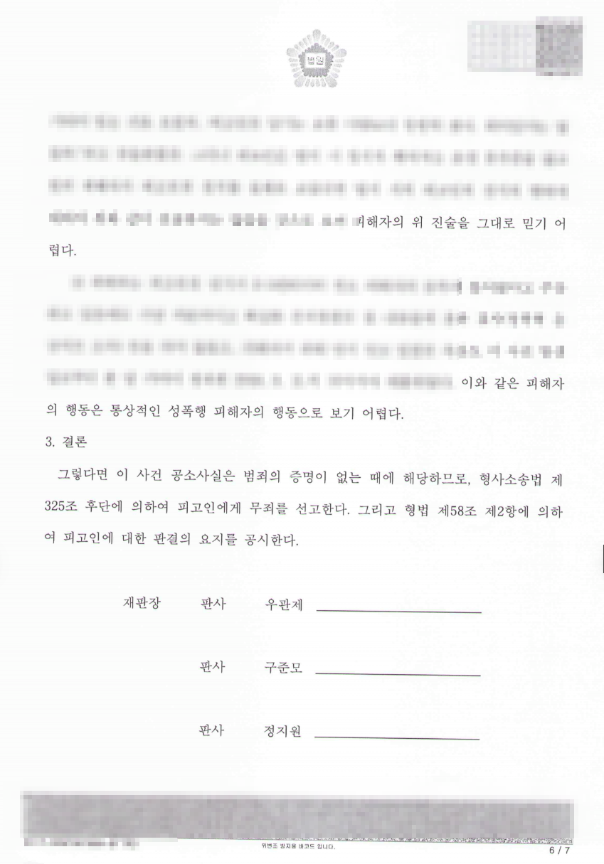 안산지원은 피해자의 진술을 믿기 어렵고, 일부 행동의 통상적인 성폭행 피해자의 행동으로 보기 어렵다고 판시하면서, 범죄의 증명이 없음을 이유로 무죄판결을 하였습니다.