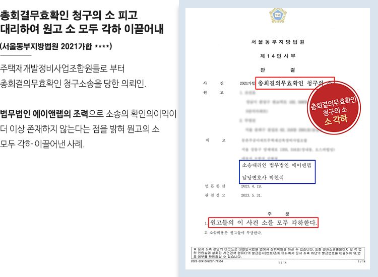그 결과 서울동부지방법원으로부터 총회결의무효확인 청구의 소에 대한 각하를 이끌어낼 수 있었습니다.