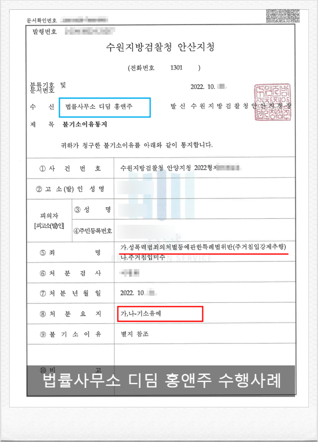 수원지방검찰청 안양지청은 비록 저의 의견과 같이 사건을 혐의없음 결정하지는 않았지만, 피의자에게 기소유예의 처분을 하였습니다. 자칫 구공판이 된다면 3년 6개월이라는 실형의 부담을 가지고 재판에 임해야 하는 어려운 싸움일 수 있었는데, 검찰의 기소유예 처분으로 인하여 신상정보 등록 등 아무런 부수처분 없이 사건이 마무리될 수 있었습니다.