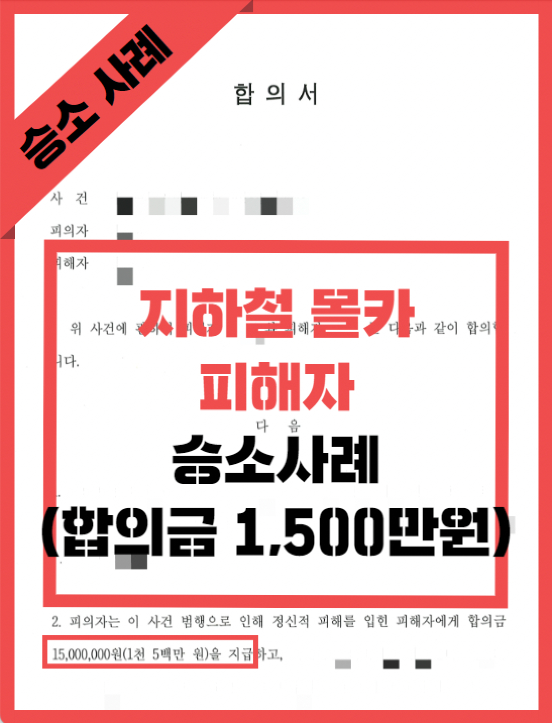최종 합의금 1,500만 원에 합의가 성립됐습니다. 피해자가 다수이며, 대중교통에서 일어난 사건임에도 높은 합의금을 받을 수 있었던 몹시 성공한 사례입니다.