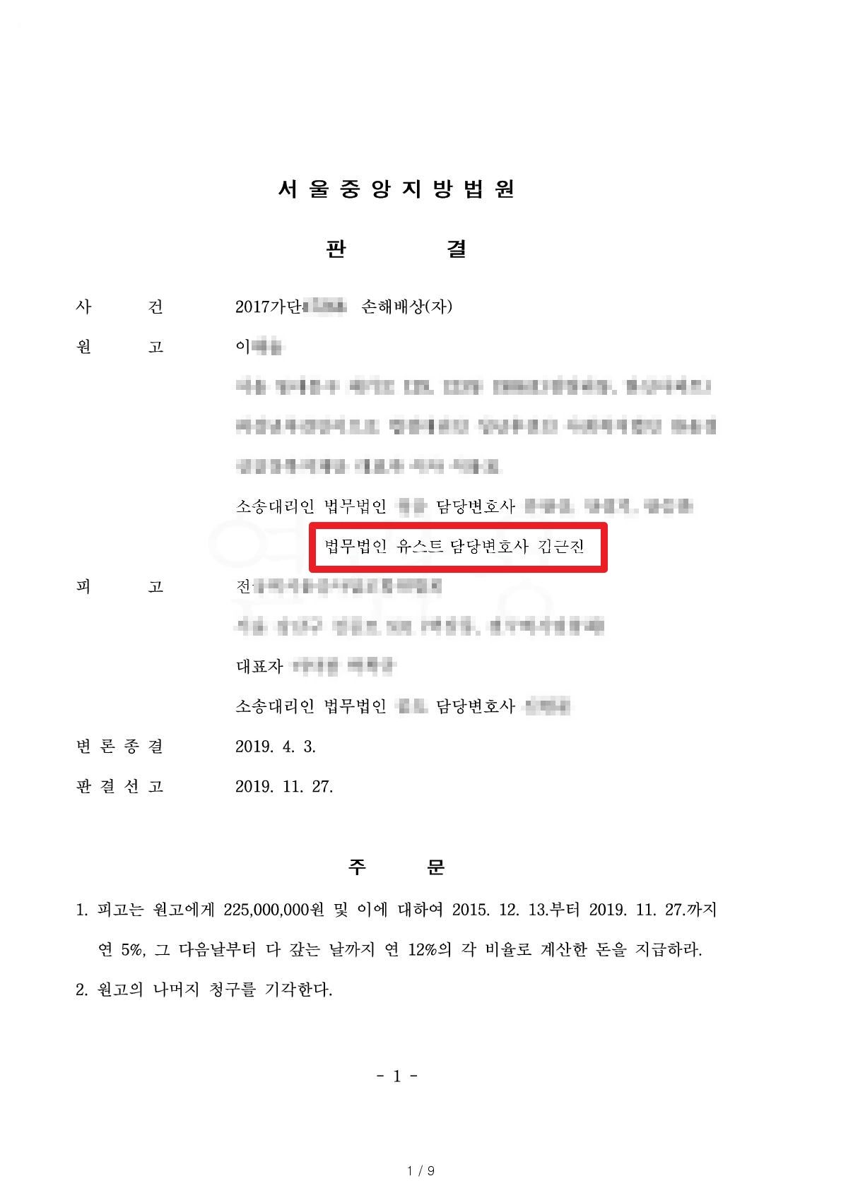 그 결과 원고 청구가 대부분 인정되어 원만히 피해회복을 받게 되었습니다.
